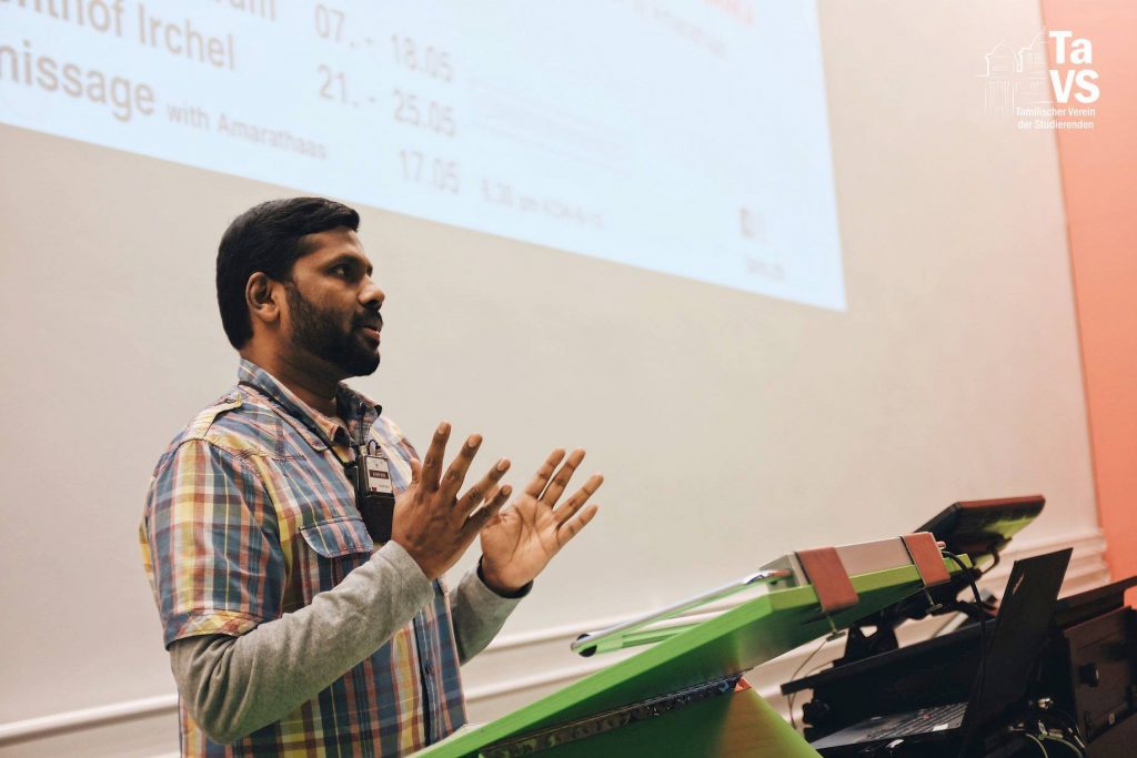 Am 17. Mai 2018, einen Tag vor dem Mullivaikal Remembrance Day, fand die Abschlussveranstaltung der Fotoausstellung “Tears of Tamils — A journey through war zones of Sri Lanka” an der Universität Zürich statt. Die Veranstaltung begann mit einer Begrüssungsrede vom TaVS Präsidenten Thuruban. Die Rede wurde teils auf Deutsch und Tamilisch gehalten, da das Publikum eine grosse Vielfalt aufwies. Im Zentrum des Events stand der Vortrag vom Fotografen Amarathaas. Viele aufschlussreiche Hintergrundinformationen zu den Bildern, die er in den letzen Tagen des Krieges vor 9 Jahren geschossen hat, allgemeine Angaben zu fototechnischen und journalistischen Aspekten im Krieg und ergreifende persönliche Erfahrungen vom Fotografen wurden mit dem Publikum geteilt. Nach der Präsentation fand eine Fragestunde statt, wobei an verschiedenen interessanten Themengebiete angeknüpft wurde.